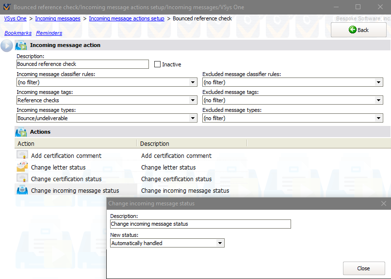 Incoming message actions are not part of the standard VSys Live implementation. In general, installing and configuring this option comes with an additional fee. See Advanced features for information.