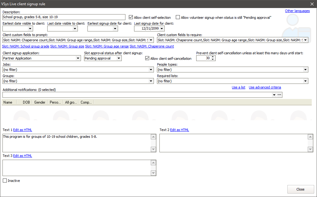 Client signup rules are part of the client management system. Each slot that represents a client opportunity has a client signup rule associated with it. That rule then controls when the slot is visible, custom fields to prompt for and require, signup application, etc.
