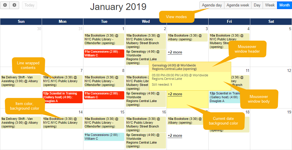 Agenda day, Agenda week, Basic day, Basic week, List, Month. See here and here for examples on how these can display. |
