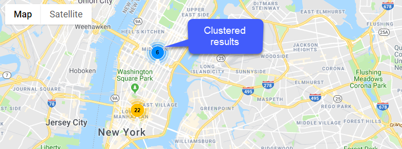 When multiple items are at the same or in very close proximity, it can be impossible to see the individual items. Check this to display them in cluster (see example below); if clustered, they'll break out and display individually as you zoom in. |