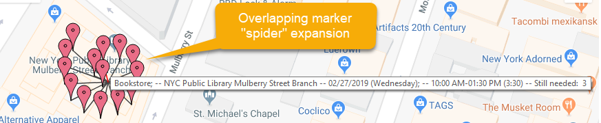 If multiple events are at exactly the same location (see third example), clustering doesn't help. Checking this shows them all under one marker, then clicking on that marker expands them out. |