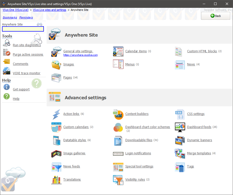 The VSys Anywhere menu that users see combines two things: the page menu from VSys Live and the tools from their tool profile.