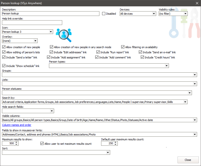 These fields show in the mouseover hint for a person. It's usually better to have more fields here and fewer in Visible columns to reduce screen clutter as well as speed up the search. |