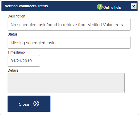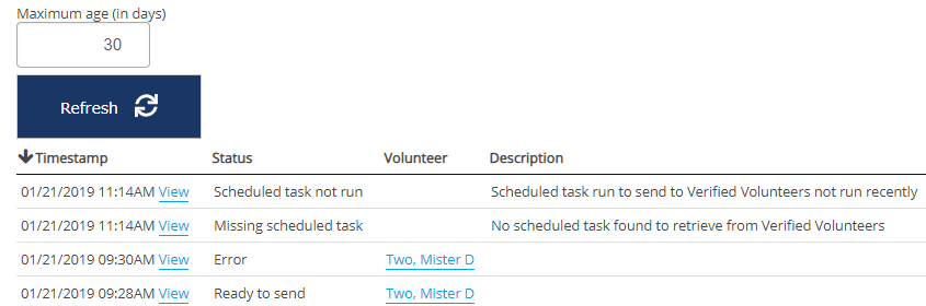 The scheduled task for sending or retrieving failed as a whole. This could mean that your Verified Volunteers login credentials are incorrect. Click on the View link for more information. |