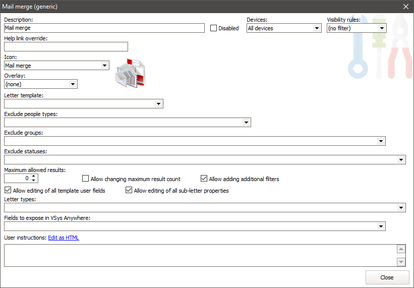 Selecting a single letter template here fixates VSys Anywhere not on that template but on letter templates with the same Data source. Leave this blank in most cases. |