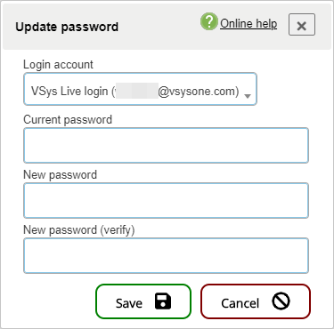 Depending on how VSys Anywhere is configured, i.e. if you can login in using either of a VSys Live account or a VSys Security account, you may be prompted for Login account: this is the account whose password you're looking to change.