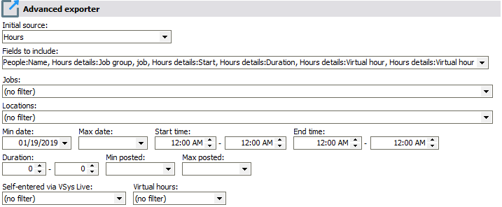 In an example here, we're going to export hours records into Excel, and include the "Virtual" properties of those records. Notice that we set the filter Virtual hours to "(no filter)": this can be used to report solely on or exclude virtual hours records.