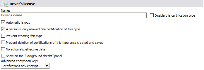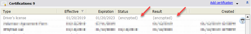 Set a certification to be encrypted in its setup. Setting the Advanced encryption key property causes VSys to encrypt all fields other than Effective date and Expiration date to be encrypted. (These two fields are always unencrypted so that you can filter and search by them.) Note that unlike the older encryption tools, you can't encrypt some fields and not others, and you certainly cannot mix and match encryption keys in the same certification.