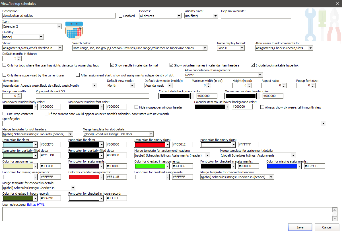 What fields should the user be shown to search by? Date range, Job, Job group, Location, Statuses, Time range, Volunteer or supervisor names. The last is the most interesting: consider the case where your information desk needs to find where a volunteer is stationed, or whether they're scheduled at all. If they have this field, they can type in "Doe" and see the schedules of anyone named Doe or any assignment or slot supervised by someone with that name. |