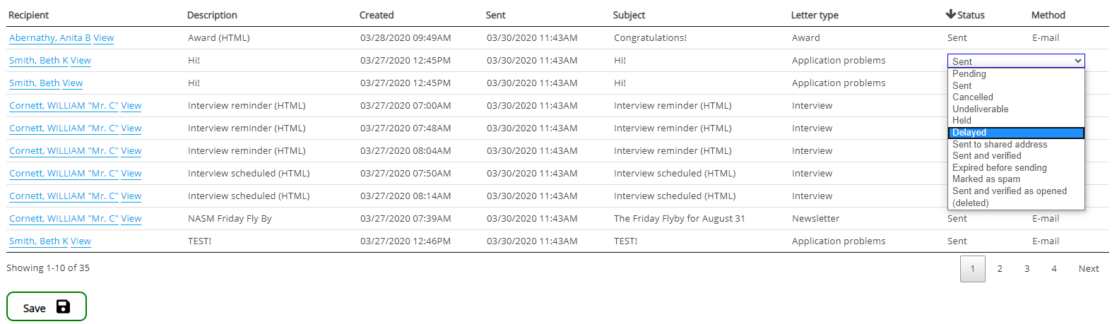 If the tool is set for inline editing, edit records by clicking directly in the grid, where you edit values directly in the table. Use the Tab key to move between fields; this is much faster than opening up each record individually and saving it. (The View link opens up the letter, but cannot edit it since the record can't be in two places in VSys at once.) You must click the Save button at the bottom for all of the individual changes to letters to be saved!
