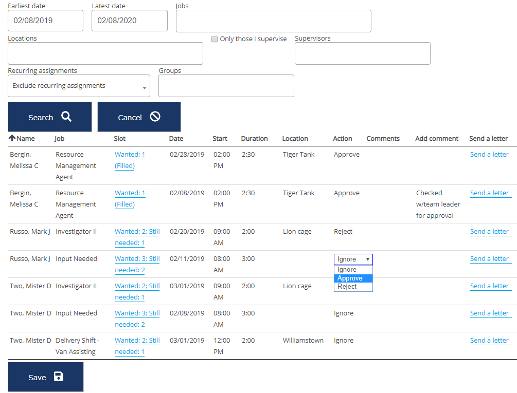 The Assignments Approval tool gives you a listing job assignments pending approval; its primary purpose is to let you find assignments to approve, cancel or reject, especially for assignments which have been self-selected using VSys Live.