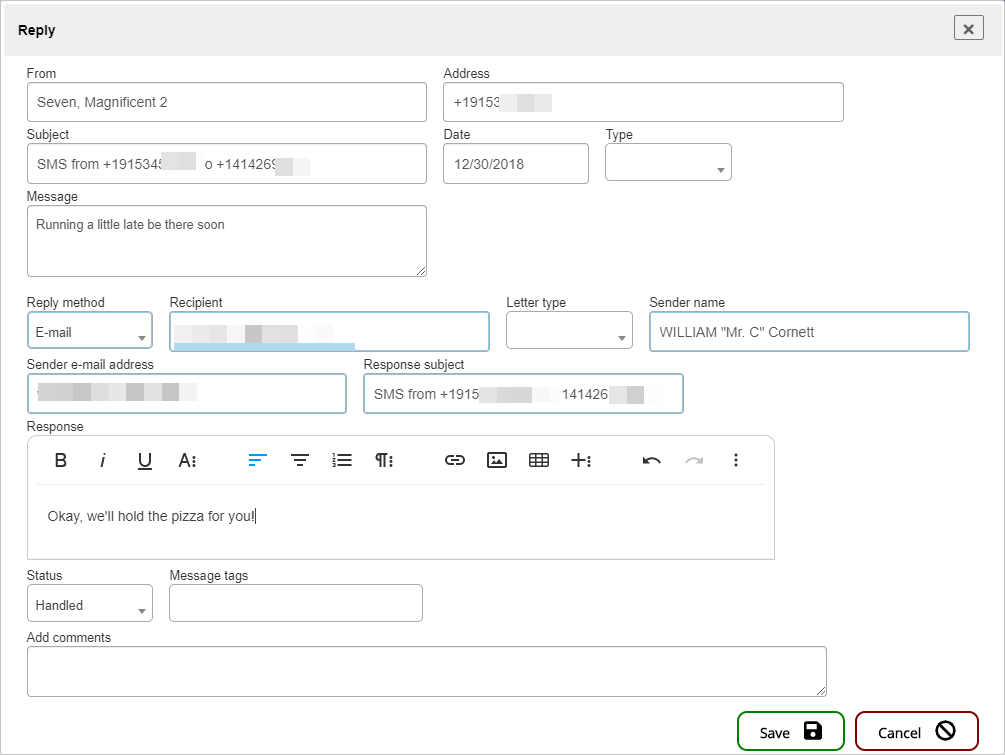 Click Edit to open the message. If the sender is not set, search for the person using the Find sender field. Change any other values then click Save.