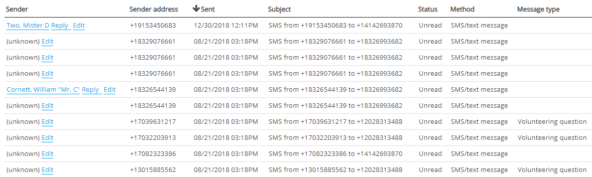 Click on a person's name to open their profile in a new window; a message where the Sender is "(unknown)" is one where VSys was unable to determine the sender based on the message's source (e-mail address, phone number, etc.). In order to send a reply, you first must link the message back to a person in VSys (below).