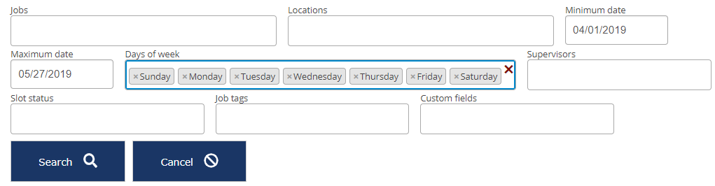 Put in your filters on Jobs, Locations, etc. Minimum date and Maximum date refer to the start dates for each slot: the tool will find the first date of any recurring slot that's within this date period. For example if a slot runs from March 1 through December 31 and you select a Minimum start date of April 1, VSys will show you only the earliest slot between those two dates, ignoring any in March.