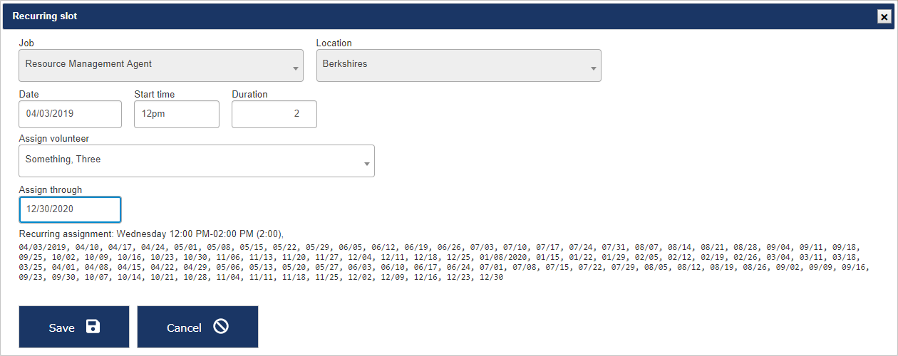 VSys doesn't actually assign the volunteer to the recurring slot: instead what it does is make a recurring assignment whose rules match those of the slot. The dates in that recurring assignment will exactly match those of the slot, and assignments will only be created on dates that the slot occurs (missing weeks in the slot will be missing weeks in the recurring assignment.) If any of the slots dates are full, VSys will prompt you to Assign volunteer anyway or Skip that date.