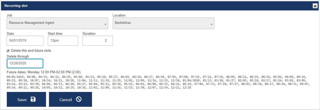 Clicking Save will delete all of the listed recurring slots through the date that you enter.