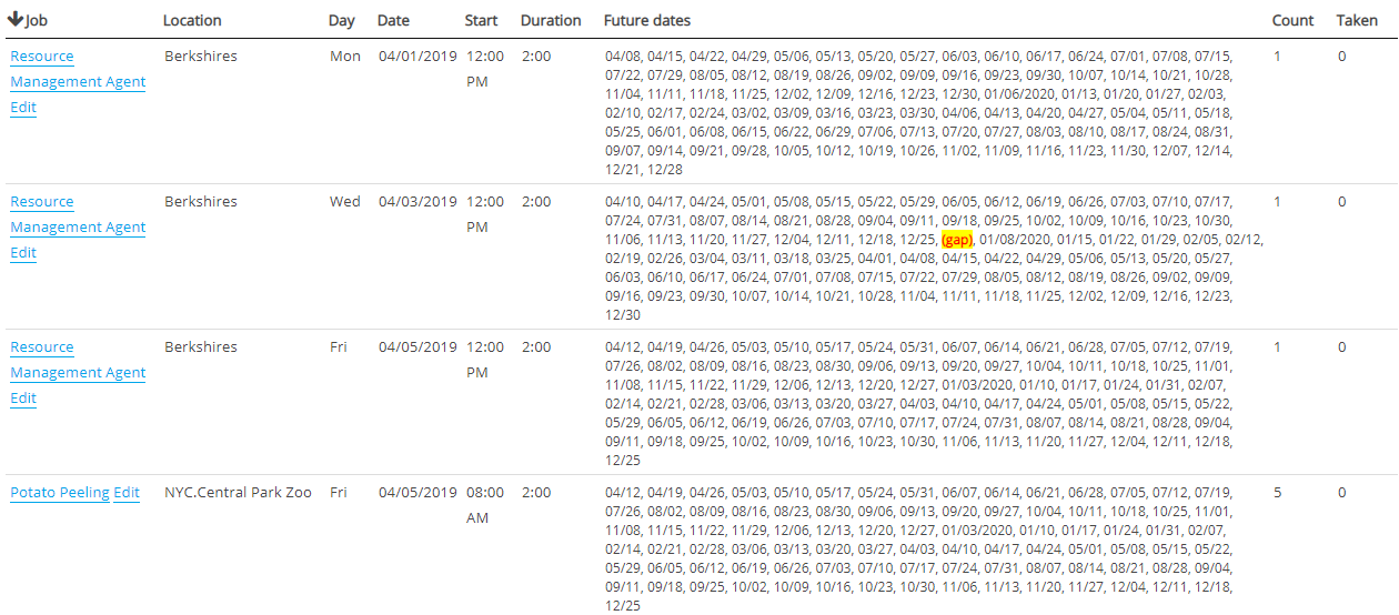 For each slot, VSys shows you the job, location, and most importantly the future dates. Any anomalies, e.g. a missing date or one that starts at other than the normal start time, is highlighted.