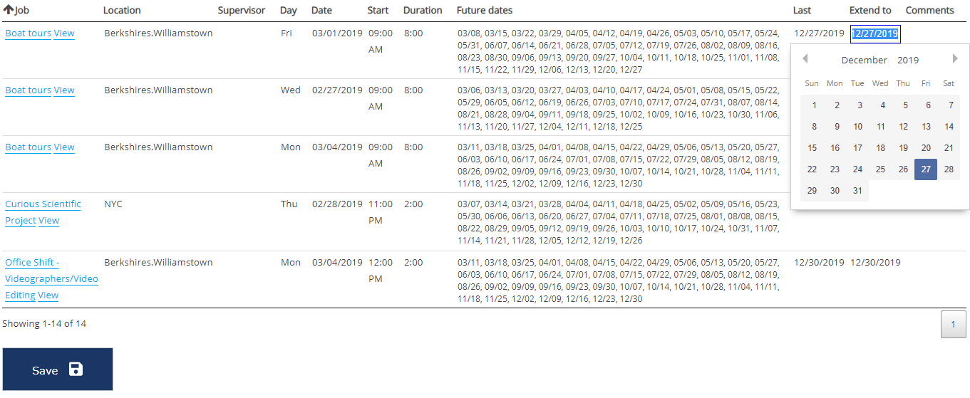 Put in your filters on Jobs, Locations, etc. Minimum last date and Maximum last date refer to the last date for each recurring slot: only those that end during this date range will be shown. Click Search.