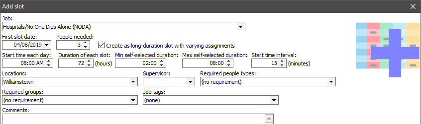 Duration of each slot may be eight hours, it could be 744 hours (30 days), or anywhere in between. This duration doesn't directly affect individual volunteer assignments, it's the overall time that needs to be covered.