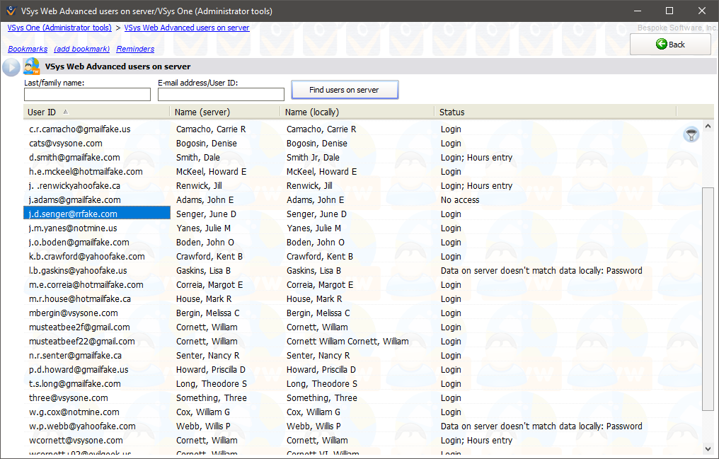 VSys gives you a tool to see users on the VSys Web Advanced server and update the data in VSys as well as push individual users up to VSys Web Advanced without having to do a database synchronization. Access this tool from the VSys Web panel under Data on Server, then VSys Web Advanced users on server.