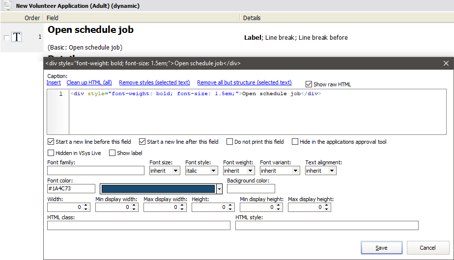 In the example above, the text "Open schedule job" will be displayed in bold and at 1.5em font sizing.