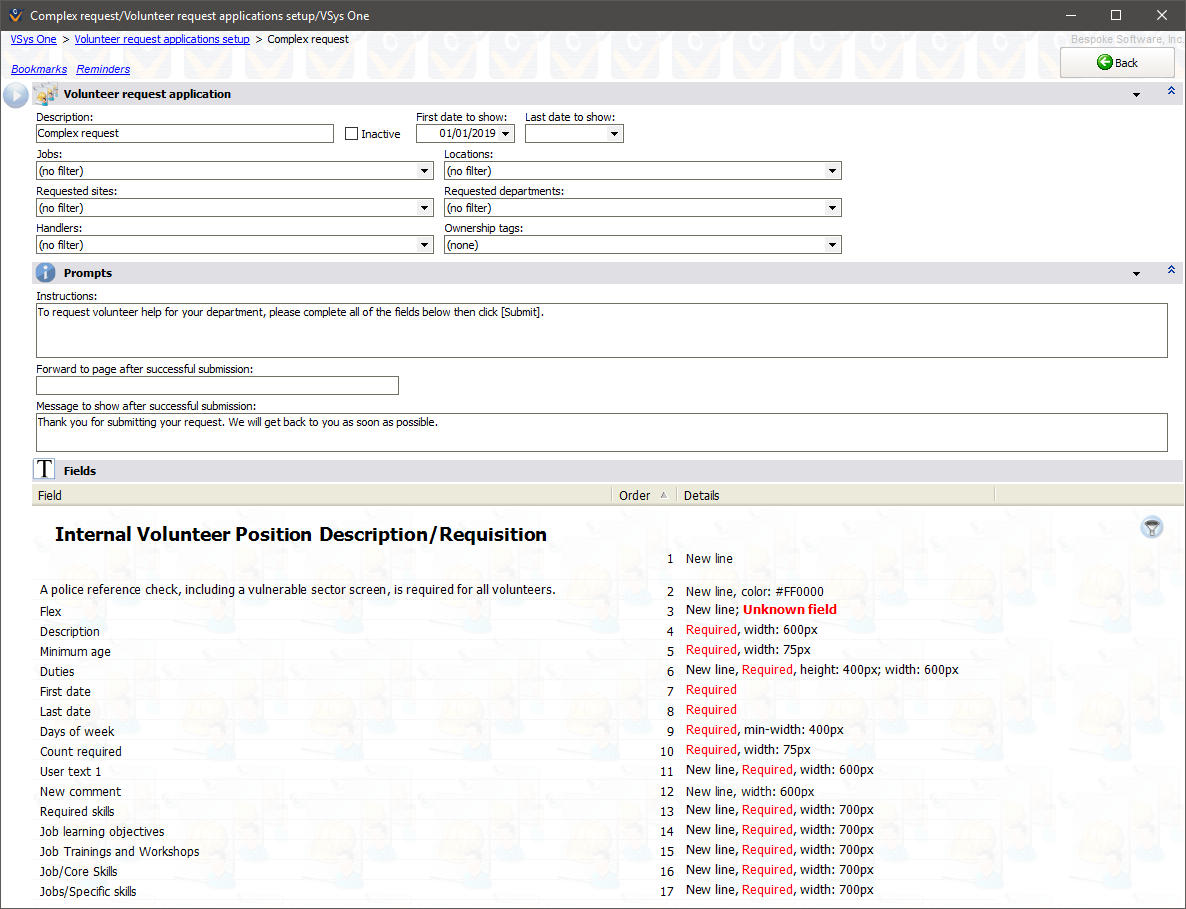 Fields on the volunteer request application are shown to the requestor in VSys Live. They may be optional or required and can be shown in any order. When the request is submitted, these are shown to the administrator processing volunteer requests. If the request is accepted, the values in these fields become part of the job or slot(s).