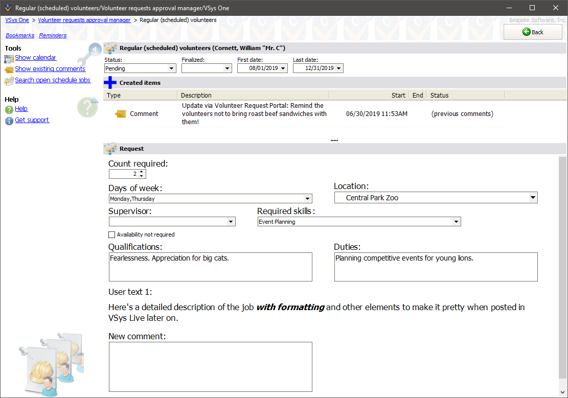Opening a request brings up the request, its status, dates, associated items and all of the fields entered by the requestor. This is the heart of the volunteer request tool.