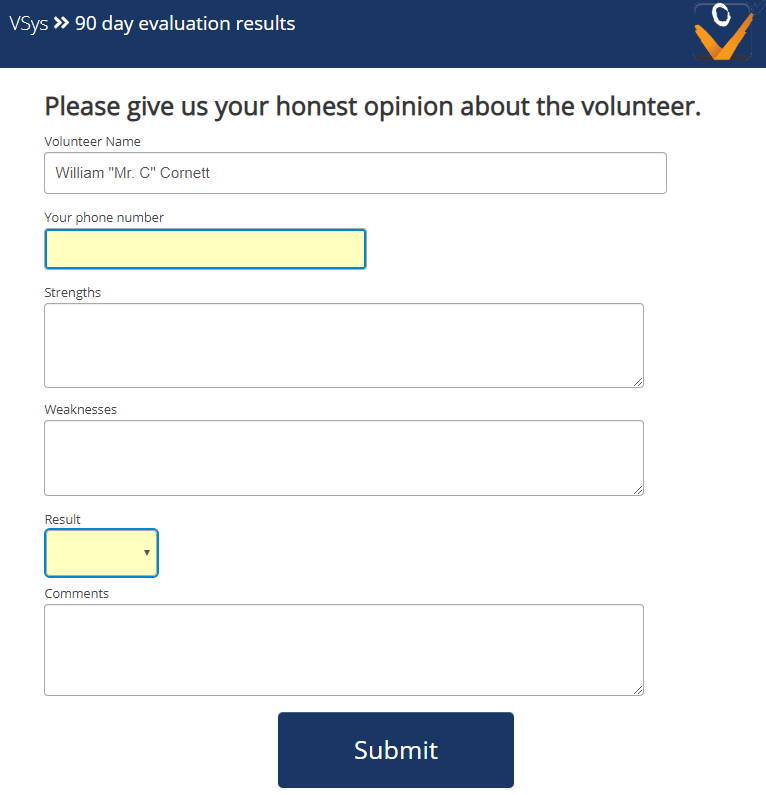 Consider the case of a 90 day evaluation: you'd like to have a volunteer's supervisor complete that evaluation without the supervisor needing to fill out a paper form or need to have their own VSys One/Anywhere login to put it into the volunteer's profile directly. Try a certification: