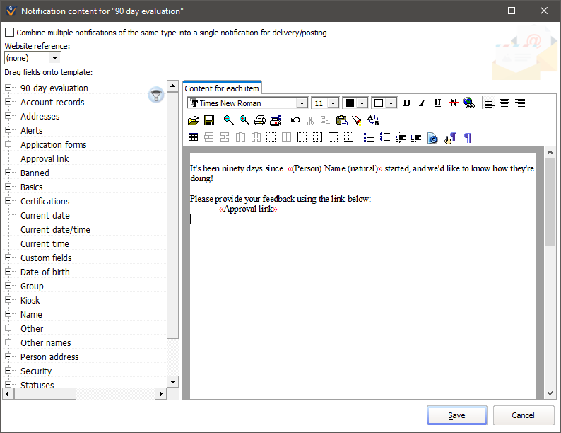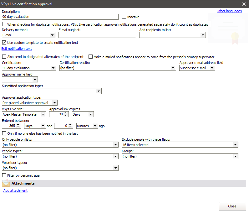 Or if you set the Approver e-mail address field and the corresponding field on the certification is a valid e-mail address, then while the notification is attached to the subscriber, it's actually sent to that e-mail address instead. This is very powerful in that it lets you notify someone who isn't a person in VSys, for example an off-site supervisor, or a parent/guardian; basically anyone with an e-mail address.