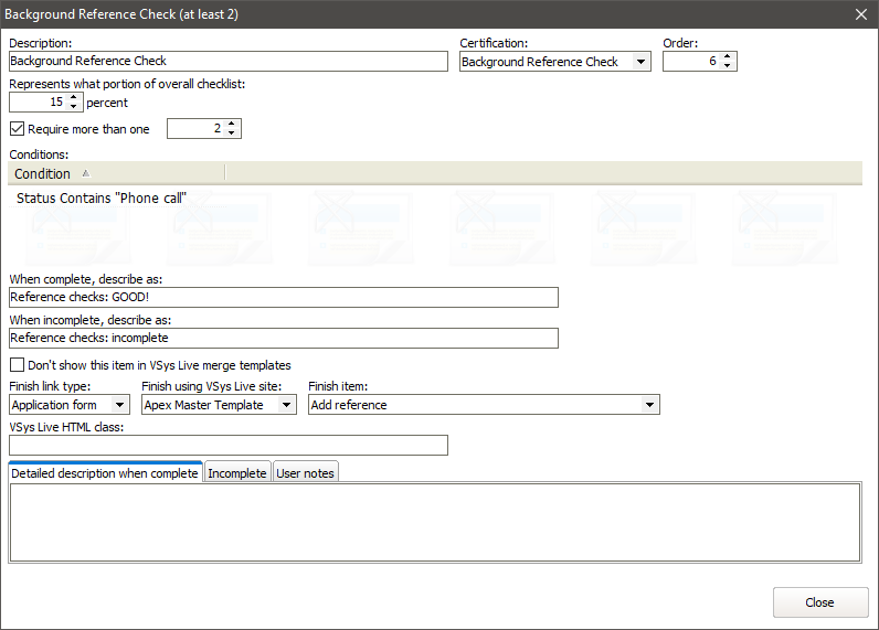 VSys Live creates this text from the individual rules in the checklist. For each rule, it uses the detail options (below) to generate the text for that rule, then it combines all of these rules together. |