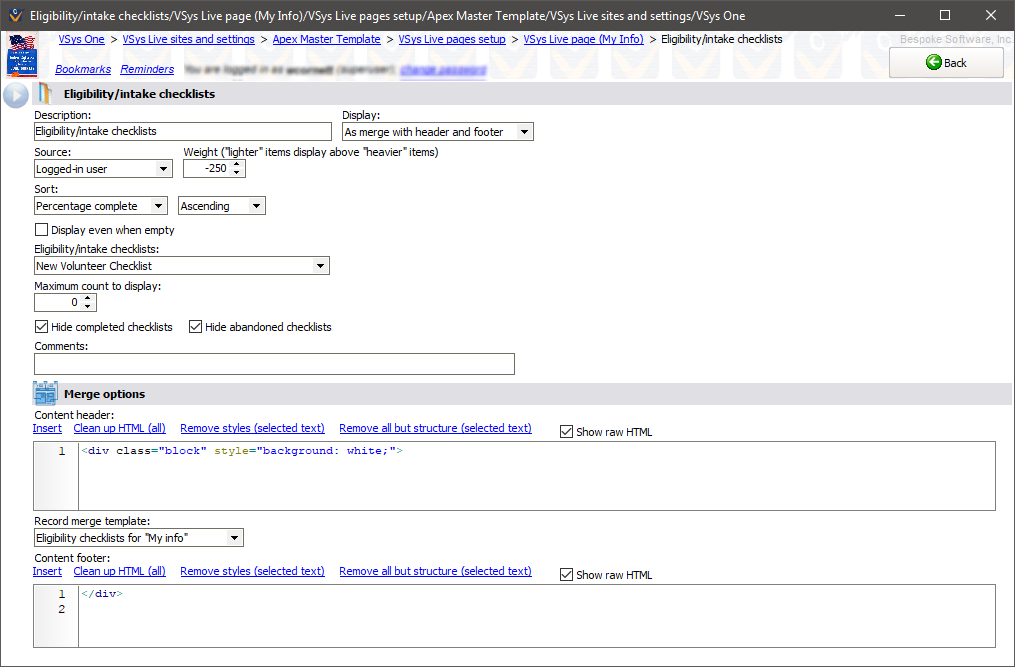 The rest of Content works like any merge template: for the overall eligibility checklist, fields such as field[[(description)|(field name)]] are replaced with the corresponding property of the eligibility checklist. Again like any other merge template, right-click to insert fields into your HTML. You've got access to all of the volunteer's details along with of course the fields from the checklist.