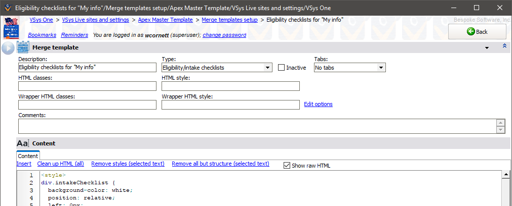 Merge templates work like old-fashioned mail merges. Mostly. In this case they're used to embed values from the eligibility checklist into an HTML template for display. The merge template used here comes in three primary parts: style, body and detail options.