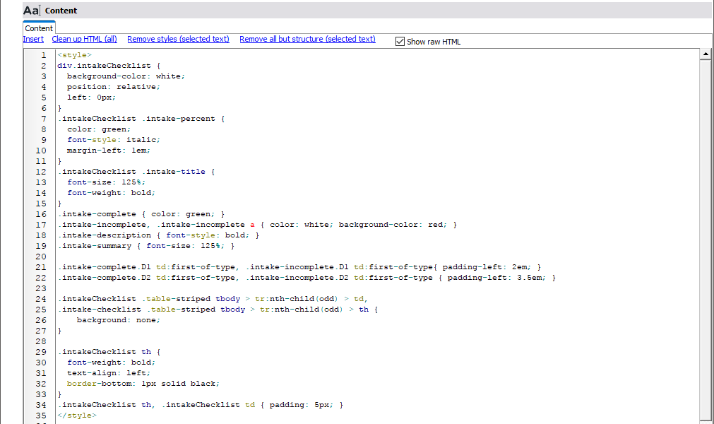 The <style>...</style> in Content is put into the web page just before the eligibility checklist itself is shown. Putting style here is optional, but you're better off using CSS style selectors and values rather than explicitly giving each item its own display formatting. (You can optionally put eligibility checklist styles into your site's CSS.)