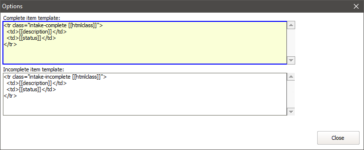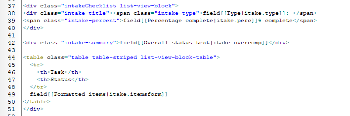 In this example we're creating an HTML table row with an HTML class appropriate to the rule's status. Then we're including the rule's description and status in cells in that row. There are no helpful right-click tools here, but these templates are very simple. Depending on whether the rule is complete or not, VSys chooses the appropriate template. Into that template you can insert a few special fields: