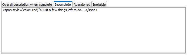 In the eligibility checklist's overall setup, we need to set four fields: Overall description when complete, Incomplete, Abandoned, and Ineligible. The values you put here are displayed where in the example above it says "Just a few things left to do" depending on the eligibility checklist's current status for the current volunteer (VSys Live will figure out which of these to use automatically). You can enter plain text or HTML in these descriptions.