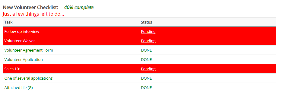 In the example above, for each required item in the volunteer's "New Volunteer Checklist" eligibility checklist, VSys Live is showing the item's description, status and for incomplete items, an optional hyperlink that they can use to finish that requirement.