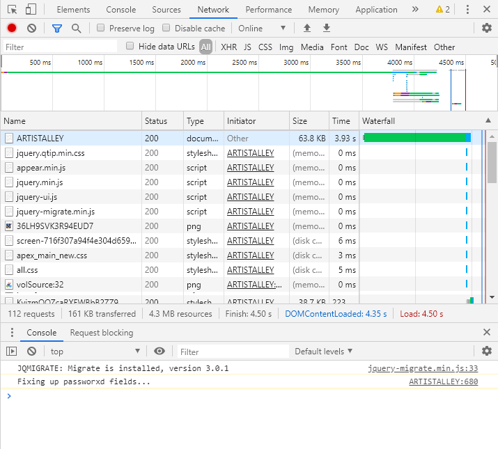 In the middle is a list of all of the detailed requests and responses (you can click on any of these to get even more information). Scroll through this list and look for any items in red: if you see one or more, that means that a request made by the browser was returned with an error.