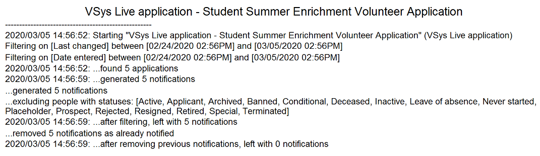 To avoid sending out the same notification over and over again, VSys tracks what notifications have been sent before. In this case VSys looked at the item in question - training record, assignment, application, what have you - and found a previous notification based on the same event (for example, "VSys Live Application") in the past, and so won't send it again here to the same recipient.