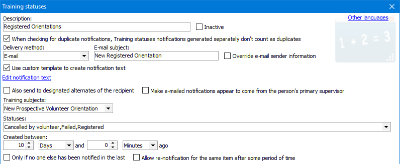 Consider the event "Training statuses". We're allowing the Statuses Cancelled by volunteer, Failed and Registered. VSys will send a notification when someone is registered for the course. A few days later the volunteer cancels online, and VSys will not send out a notification about that. Why? Because this event in this subscription has already sent a notification, and VSys has no way of knowing that you meant that a change in status was enough to warrant a new notification. So what should we do? Create two different events: