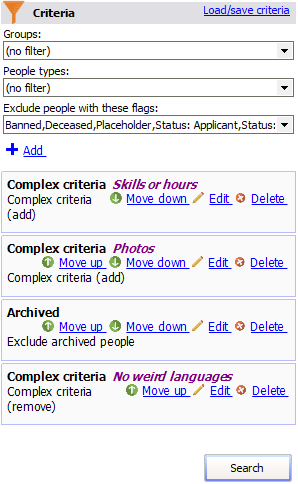 This wouldn't be possible without these complex criteria filters: normally a person must meet all of your criteria to be included. Here we're saying that they can either have matching hours or a photo (or both); you can only do that with complex filters. (The requirement that they do not speak Klingon or Dothraki could possibly be done by saying "None of" for those languages, but it's helpful as an example here.)
