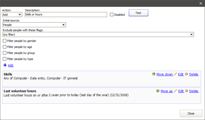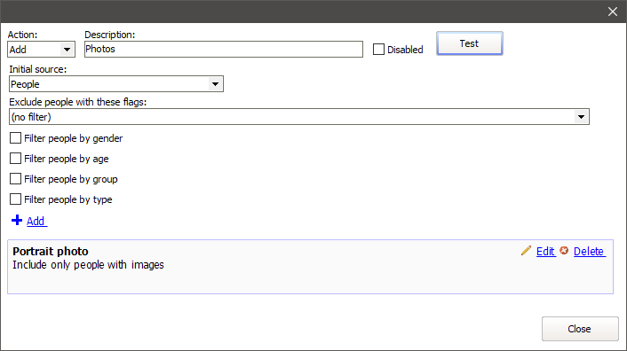 Its Action is also Add, but now things get interesting: where a normal filter would simply require that everyone have a photo, what this does is add the people who have a photo to the list of people VSys is already considering! This effectively tells VSys that a person qualifies if they're already in the prospect list based on previous filters they're good, but they're also good if they meet this filter even if they don't meet the previous ones!