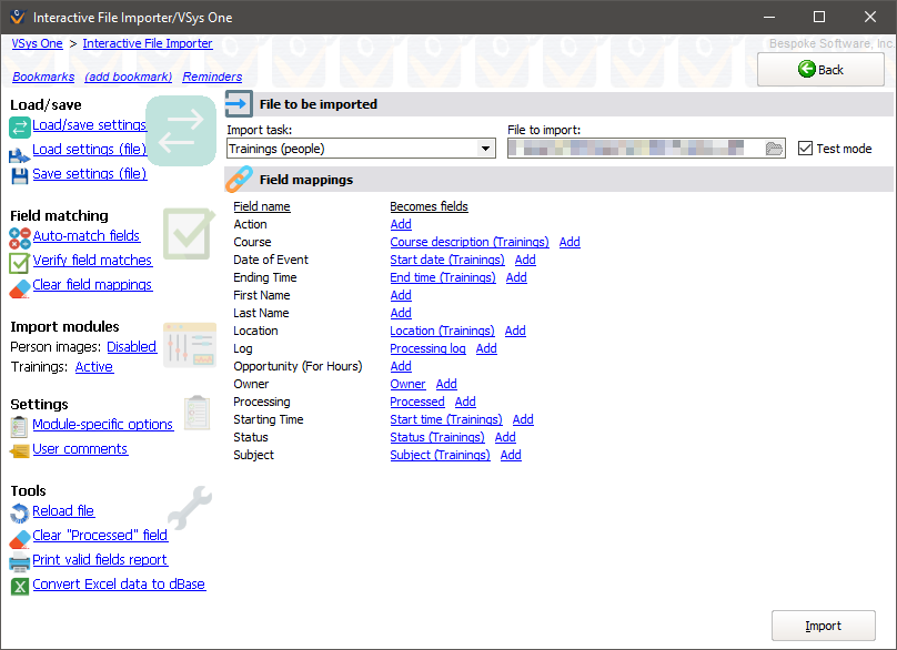 Start by determining the type of information you want to import, and then select the most appropriate task above. To see what fields are available, click on the Print valid fields report link. This gives you, grouped by module, a listing of what fields can be imported. Note that you can import the same file more than once in order to process bits of data which can’t be imported in one pass.