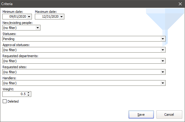 Approval statuses, Requested departments, Requested sites, Application handlers |