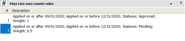 Now we're looking at applications during the same time period, but only those with a status of Pending. More importantly, we've set the Weight to 0.5, meaning that these applications count as 1/2 of an Approved application.