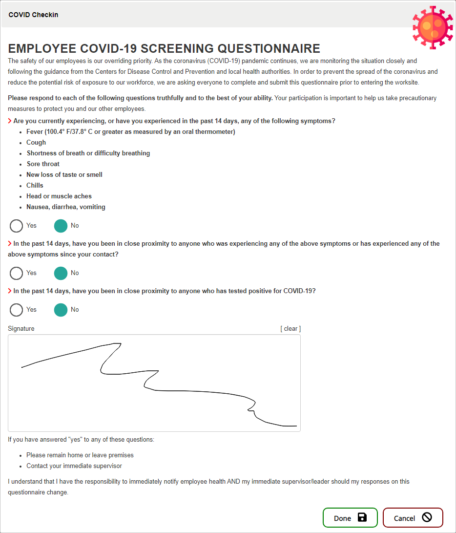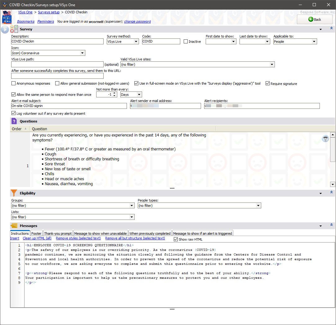 Why? The obvious choice is COVID screening, to prompt volunteers at the beginning of their shifts to present them with useful instructions, ensure that they don't meet any risk criteria, and take action if they do meet any of your defined criteria.