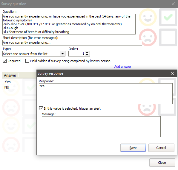 Surveys with alerts are only available on VSys Live and VSys Live Kiosk.