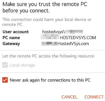 You will see a pop up; check Never ask again for connections to this PC and click Connect.
